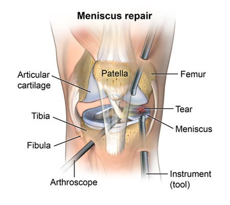 Arthroscopic meniscus repair is an outpatient surgical procedure to repair torn knee cartilage. The torn meniscus is repaired by a variety of minimally invasive techniques and requires postoperative protection to allow healing. Physical therapy is useful to regain full function of the knee, which occurs on average 4-5 months after surgery.